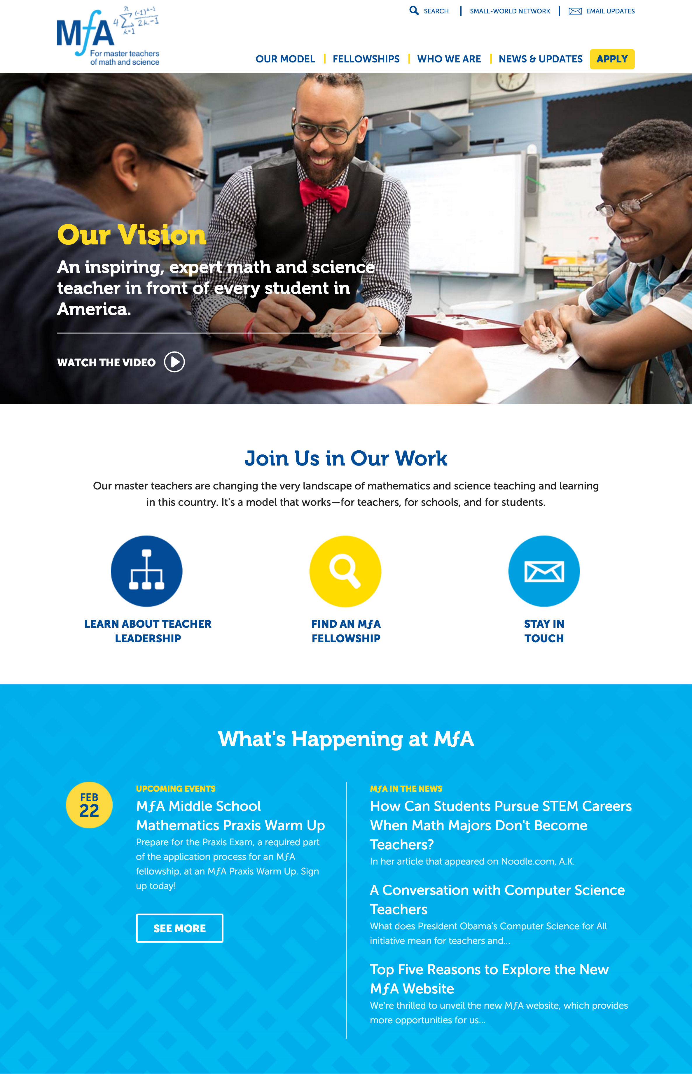 The homepage is an important first stop on the path to discovering the Math for America mission, so we loaded it with different entry points into the site–including menus, slideshows, images, text, and vital links to useful resources.