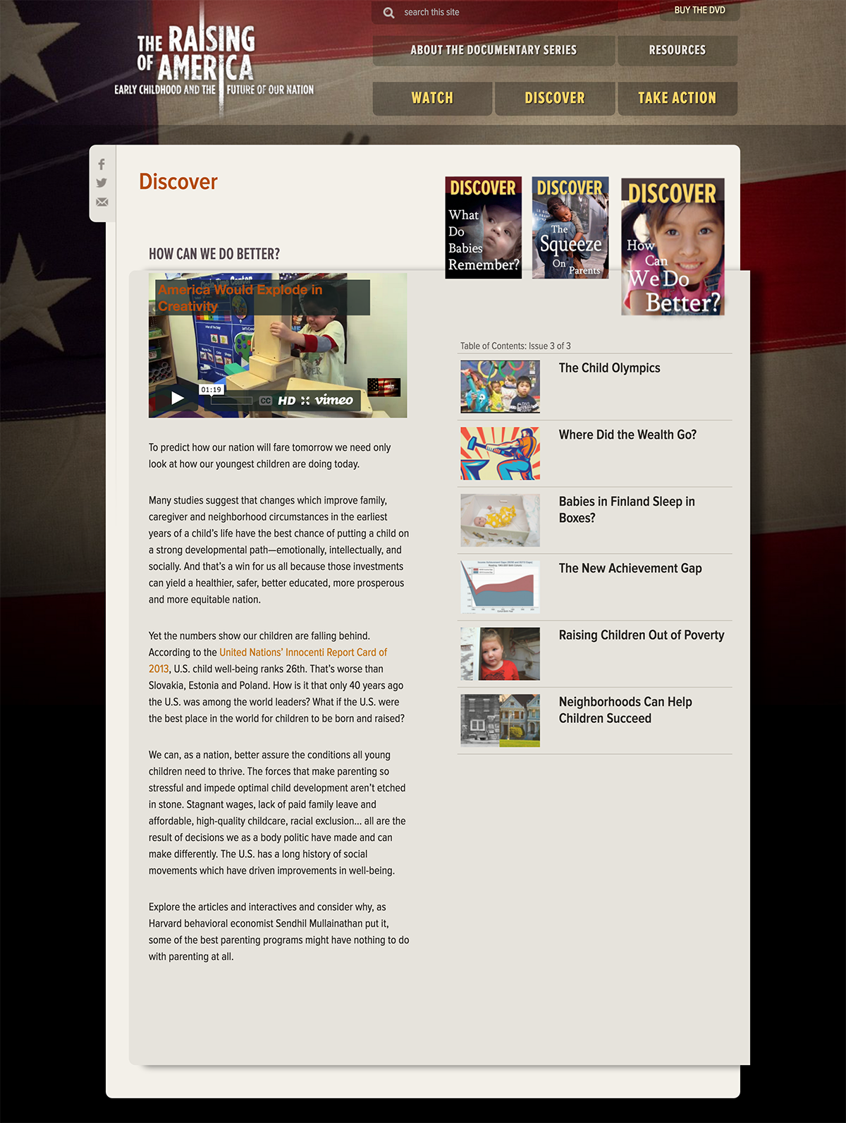 Our regular partners at Free Range teamed up with us to build a site for the five-part PBS documentary series The Raising of America. We produced an attractive online portal to the show that combines hard-hitting reportage with the ability to easily stream, download, and buy episodes from the series. The site goes far beyond most online destinations for TV shows, with interactive games, educational resources, toolkits, and many other features all included.