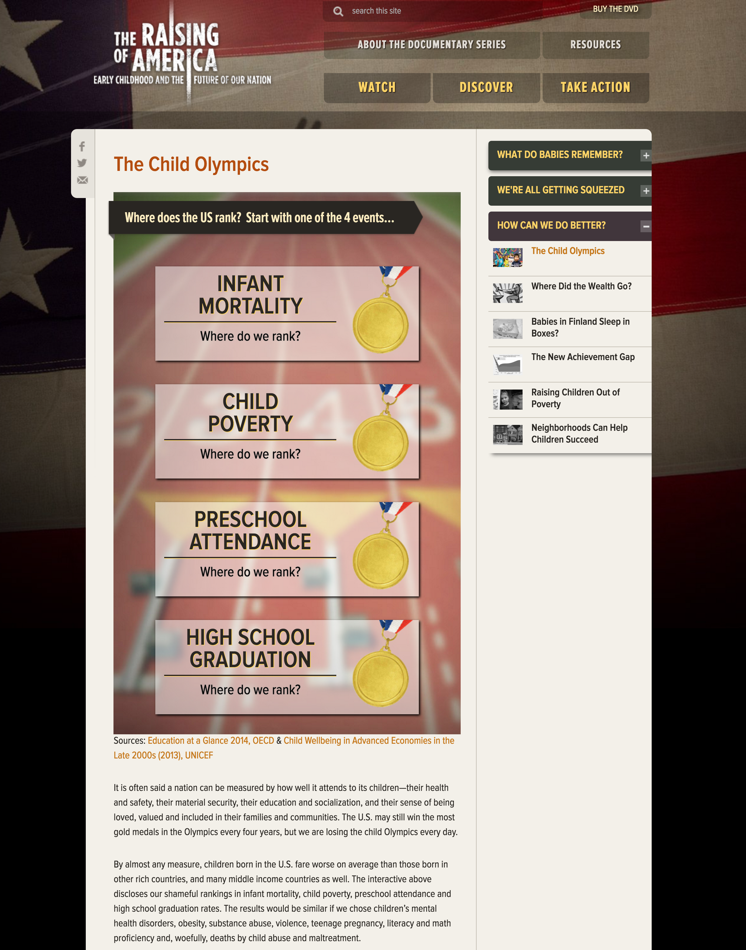The Raising of America includes an innovative interactive games section, which we built using a Javascript library. All the games build from a simple premise–asking the user to figure out where the US ranks in various childcare-themed lists, with a simple drag-and-drop interface included for ease-of-use.